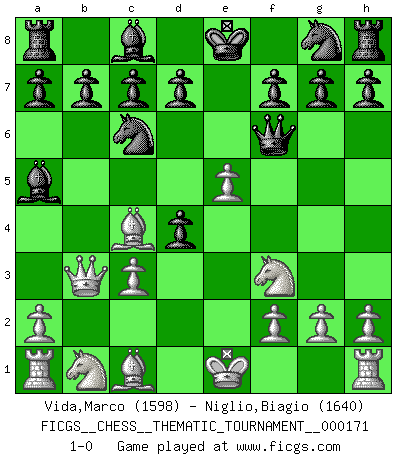 Last move : 1-0 2014 January 29 12:1:58 [Event "FICGS__CHESS__THEMATIC_TOURNAMENT__000171"] [Site "FICGS"] [Date "2013.12.02"] [Round "1"] [White "Vida,Marco"] [Black "Niglio,Biagio"] [Result "1-0"] [WhiteElo "1598"] [BlackElo "1640"] 1.e4 e5 2.Nf3 Nc6 3.Bc4 Bc5 4.b4 Bxb4 5.c3 Ba5 6.d4 exd4 7.Qb3 Qf6 8.e5 1-0 This chess game has been lost on time (started : 2013.12.02 11:15:42) Evans gambit Player White won this chess game. Follow this game move after move (download)I'd rather have a Pawn than a finger. (Reuben Fine) Ich erzeugte keinen Neid, da mich die Schachspieler als Musiker und die Musiker als Schachspieler betrachteten. (Mark Taimanov) Yo siempre he tenido un ligero sentimiento de lástima por una persona que no tiene conocimiento del Ajedrez. (Siegbert Tarrasch) J'apprécie les joueurs d'est-indienne, c'est grâce à eux que je nourris ma famille depuis tant d'années. (Petrosian) Men never do evil so completely and cheerfully as when they do it from religious conviction. (Blaise Pascal)