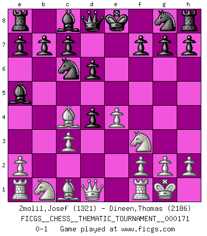 Last move : 0-1 2014 February 8 12:46:46 [Event "FICGS__CHESS__THEMATIC_TOURNAMENT__000171"] [Site "FICGS"] [Date "2013.12.02"] [Round "1"] [White "Zmolil,Josef"] [Black "Dineen,Thomas"] [Result "0-1"] [WhiteElo "1321"] [BlackElo "2186"] 1.e4 e5 2.Nf3 Nc6 3.Bc4 Bc5 4.b4 Bxb4 5.c3 Ba5 6.d4 exd4 7.O-O d6 0-1 Evans gambit Kingside Castling by player White (move 7) Player Black won this chess game. Follow this game move after move (download)Alekhine is a poet who creates a work of art out of something that would hardly inspire another man to send home a picture post card. (Max Euwe) Ich verstehe mehr vom Schach als irgendein anderer lebender Meister. (José Raúl Capablanca) Una partida de Ajedrez se divide en 3 etapas: la primera cuando piensas que tienes la ventaja, la segunda cuando crees que tienes la ventaja y la tercera... ¡cuando te das cuenta que vas a perder!. (Savielly Tartakower) Vous n'êtes pas toujours obligé de jouer le meilleur coup. Un coup doit être actif, entreprenant, correct et beau ! (David Bronstein) The weakness of an artist is dogma. (Josh Waitzkin)