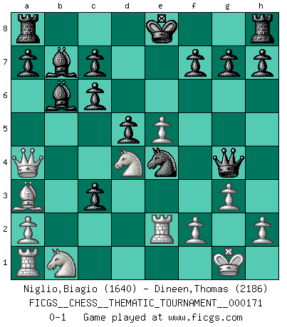 Last move : 0-1 2014 February 15 1:12:38 [Event "FICGS__CHESS__THEMATIC_TOURNAMENT__000171"] [Site "FICGS"] [Date "2013.12.02"] [Round "1"] [White "Niglio,Biagio"] [Black "Dineen,Thomas"] [Result "0-1"] [WhiteElo "1640"] [BlackElo "2186"] 1.e4 e5 2.Nf3 Nc6 3.Bc4 Bc5 4.b4 Bxb4 5.c3 Ba5 6.d4 exd4 7.O-O Nf6 8.Ba3 d6 9.e5 Ne4 10.Re1 d5 11.Bb5 dxc3 12.Bxc6+ bxc6 13.Qa4 Bb6 14.Re2 Bb7 15.Nd4 Qh4 16.g3 Qg4 0-1 Evans gambit Kingside Castling by player White (move 7) Player Black won this chess game. Follow this game move after move (download)Chess is the gymnasium of the mind. (Blaise Pascal) Kann Schach nicht schließlich das Nationalspiel der Deutschen werden? Und welche weiteren Ausblicke bieten sich dann dar! Welche Hebung des allgemeinen Kultur-Niveaus, ja der Moral, wenn das Schachbrett den Kartentisch verdrängen würde! Wahrlich, ein Ziel, des Schweißes der Edlen wert! (Siegbert Tarrasch) Antes de los Finales, los dioses han colocado el Juego Medio. (Siegbert Tarrasch) Le moment que je préfère le plus dans une rencontre, c'est celui où je sens que la personnalité de l'adversaire se brise. (Robert Fischer) Now you put water in a cup, it becomes the cup; You put water into a bottle it becomes the bottle; You put it in a teapot it becomes the teapot. Water can flow or it can crash. Be water, my friend. (Bruce Lee)