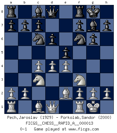 Last move : 0-1 2007 February 19 13:20:50 [Event "FICGS__CHESS__RAPID_A__000013"] [Site "FICGS"] [Date "2007.02.09"] [Round "1"] [White "Pech,Jaroslav"] [Black "Porkolab,Sandor"] [Result "0-1"] [WhiteElo "1929"] [BlackElo "2000"] 1.c4 Nf6 2.Nc3 g6 3.Nf3 Bg7 4.e4 d6 5.d4 O-O 6.Be2 e5 7.O-O Nc6 0-1 English Opening Kingside Castling by player Black (move 5) Kingside Castling by player White (move 7) Player Black won this chess game. Follow this game move after move (download)When I have White, I win because I am white; When I have Black, I win because I am Bogolyubov. (Bogolyubov) Schach sollte überall auf der Welt Schulfach werden. Es fördert die geistige Auseinandersetzung. Es lehrt die Demut in der Niederlage. (Garry Kasparov) El jugador táctico debe saber que hacer cuando algo se debe de hacer. El estratégico debe saber que hacer cuando nada se debe de hacer. (Savielly Tartakover) Les Echecs sont affaire de jugement sensible. Savoir quand frapper et quand esquiver. (Fischer) The modern world has divided itself into Conservatives and Progressives. The business of Progressives is to go on making mistakes. The business of the Conservatives is to prevent the mistakes from being corrected. (G.K. Chesterton)