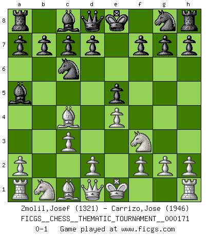 Last move : 0-1 2014 February 6 12:47:56 [Event "FICGS__CHESS__THEMATIC_TOURNAMENT__000171"] [Site "FICGS"] [Date "2013.12.02"] [Round "1"] [White "Zmolil,Josef"] [Black "Carrizo,Jose"] [Result "0-1"] [WhiteElo "1321"] [BlackElo "1946"] 1.e4 e5 2.Nf3 Nc6 3.Bc4 Bc5 4.b4 Bxb4 5.c3 Ba5 0-1 Evans gambit Player Black won this chess game. Follow this game move after move (download)Bobby is the most misunderstood, misquoted celebrity walking the face of this earth. (Yasser Seirawan) Ich kämpfe solange mein Gegner einen Fehler machen kann. (Emanuel Lasker) Solo existe una cosa que Fischer hace en el Ajedrez sin placer: ¡perder!. (Boris Spassky) Assurément je connaissais par expérience le mystérieux attrait de ce jeu royal, le seul entre tous les jeux inventés par les hommes qui échappe souverainement à la tyrannie du hasard, le seul où l'on ne doive sa victoire qu'à son intelligence ou plutôt à une certaine forme d'intelligence. Mais n'est-ce pas déjà le limiter injurieusement que d'appeler les échecs un jeu ? N'est-ce pas une science, un art ou quelque chose qui, comme le cercueil de Mahomet entre ciel et terre, est suspendu entre l'un et l'autre, et qui réunit un nombre incroyable de contraires ? [...] C'est une pensée qui ne mène à rien, une mathématique qui n'établit rien, un art qui ne laisse pas d'uvre, une architecture sans matière; et il l'a prouvé néanmoins qu'il était plus durable, à sa manière, que les livres ou que tout autre monument, ce jeu unique qui appartient à tous les peuples et à tous les temps, et dont personne ne sait quel dieu en fit don à la terre pour tuer l'ennui, pour aiguiser l'esprit et stimuler l'âme. Où commence-t-il, où finit-il ? (Stefan Zweig) I find your interest interesting. (Gregory House, House M.D.)