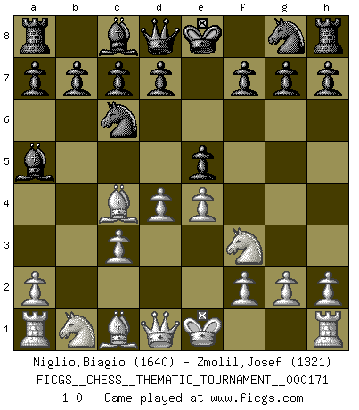 Last move : 1-0 2014 February 6 0:48:35 [Event "FICGS__CHESS__THEMATIC_TOURNAMENT__000171"] [Site "FICGS"] [Date "2013.12.02"] [Round "1"] [White "Niglio,Biagio"] [Black "Zmolil,Josef"] [Result "1-0"] [WhiteElo "1640"] [BlackElo "1321"] 1.e4 e5 2.Nf3 Nc6 3.Bc4 Bc5 4.b4 Bxb4 5.c3 Ba5 6.d4 1-0 Evans gambit Player White won this chess game. Follow this game move after move (download)Alekhine is a poet who creates a work of art out of something that would hardly inspire another man to send home a picture post card. (Max Euwe) Smyslow ist ein Beweis dafür, dass ich noch zehn Jahre spielen kann! [der 75 jährige über den 85 jährigen] (Viktor Kortschnoi) El juego de Fischer siempre fue nítido, racional y brillante. Uno de los mejores por siempre. (Dave Regis) Les Echecs représentent une sphère d'idées créatrices basée sur la volonté des deux protagonistes. (Smyslov) History is a gallery of pictures in which there are few originals and many copies. (Alexis de Tocqueville)
