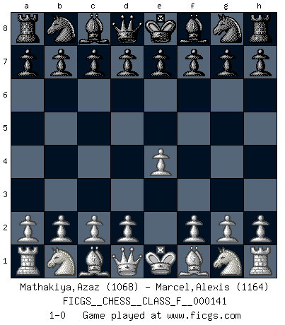 Last move : 1-0 2014 January 11 22:48:2 [Event "FICGS__CHESS__CLASS_F__000141"] [Site "FICGS"] [Date "2013.12.02"] [Round "1"] [White "Mathakiya,Azaz"] [Black "Marcel,Alexis"] [Result "1-0"] [WhiteElo "1068"] [BlackElo "1164"] 1.e4 1-0 This chess game has been lost on time (started : 2013.12.02 11:32:4) King's pawn Opening Player White won this chess game. Follow this game move after move (download)He who takes the Queen's Knight's Pawn will sleep in the streets. (Anonymous) Über Kasparov: Es ist offensichtlich, daß er in einem totalitären Staat aufwuchs und deshalb zu diktatorischen Zügen neigt. (Viktor Kortschnoi) ¿Porque tengo que perder ante este idiota?. (Aron Nimzovich) Horreur, mais aussi harmonie suprême : qu'y avait-il en effet au monde en dehors des échecs ? Le brouillard, l'inconnu, le non-être... (Vladimir Nabokov) Lamb in skin of tiger, still fears the wolf. (Chinese proverb)