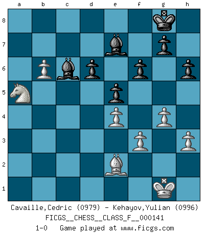 Last move : 1-0 2014 March 27 17:5:3 [Event "FICGS__CHESS__CLASS_F__000141"] [Site "FICGS"] [Date "2013.12.02"] [Round "1"] [White "Cavaille,Cedric"] [Black "Kehayov,Yulian"] [Result "1-0"] [WhiteElo "0979"] [BlackElo "0996"] 1.e4 e5 2.Nf3 d6 3.d4 c6 4.d5 Nf6 5.Nc3 Be7 6.Bg5 O-O 7.Be2 h6 8.Bxf6 Bxf6 9.O-O Bg4 10.h3 Bh5 11.a3 Nd7 12.b4 cxd5 13.Nxd5 Nb6 14.Nxb6 Qxb6 15.Qd5 Rac8 16.c4 Qc6 17.Qxc6 Rxc6 18.Rac1 b6 19.g4 Bg6 20.Nd2 Rfc8 21.f3 b5 22.Rc2 a6 23.Rfc1 bxc4 24.Rxc4 Rxc4 25.Rxc4 Rxc4 26.Nxc4 Be7 27.a4 f6 28.b5 axb5 29.axb5 Be8 30.b6 Bc6 31.Na5 1-0 Philidor's defense Kingside Castling by player Black (move 6) Kingside Castling by player White (move 9) Player White won this chess game. Follow this game move after move (download)It's just you and your opponent at the board and you're trying to prove something. (Bobby Fischer) Ich spiele ehrlich und spiele, um zu gewinnen. Wenn ich verliere nehme ich meine Medizin. (Robert James Fischer) Fischer deseaba darle a los Rusos una sopa de su propia medicina. (Larry Evans) Le moment que je préfère le plus dans une rencontre, c'est celui où je sens que la personnalité de l'adversaire se brise. (Robert Fischer) A government big enough to give you everything you want is strong enough to take everything you have. (Thomas Jefferson)