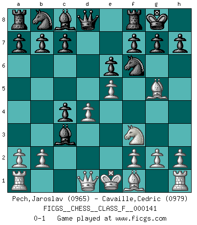 Last move : 0-1 2014 February 1 22:49:11 [Event "FICGS__CHESS__CLASS_F__000141"] [Site "FICGS"] [Date "2013.12.02"] [Round "1"] [White "Pech,Jaroslav"] [Black "Cavaille,Cedric"] [Result "0-1"] [WhiteElo "0965"] [BlackElo "0979"] 1.d4 d5 2.c4 dxc4 3.Nf3 Nf6 4.Nc3 e6 5.e4 Bb4 6.Bg5 O-O 7.e5 Bxc3+ 0-1 This chess game has been lost on time (started : 2013.12.02 11:32:4) QGA, 4.Nc3 Kingside Castling by player Black (move 6) Player Black won this chess game. Follow this game move after move (download)I'm not a materialistic person, in that, I don't suffer the lack or loss of money. The absence of worldly goods I don't look back on. For Chess is a way I can be as materialistic as I want without having to sell my soul. (Jamie Walter Adams) Wie ich sie so einen nach dem anderen nieder mähte wurde meine Überlegenheit offensichtlich. (José Raúl Capablanca) El Ajedrez es una hermosa aventura. (Bent Larsen) Des points faibles ou des trous dans la position de l'adversaire doivent être occupés par des pièces et non pas par des pions. (Siegbert Tarrasch) To err is human, to shift the blame on someone else is tactical. (Mladen Jankovic)