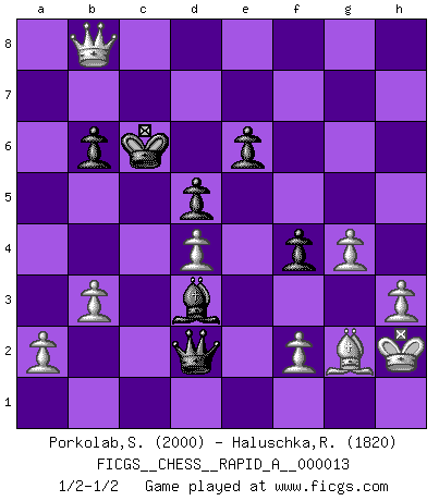Last move : 1/2-1/2 2007 July 2 18:34:13 [Event "FICGS__CHESS__RAPID_A__000013"] [Site "FICGS"] [Date "2007.02.09"] [Round "1"] [White "Porkolab,Sandor"] [Black "Haluschka,Rainer"] [Result "1/2-1/2"] [WhiteElo "2000"] [BlackElo "1820"] 1.Nf3 Nf6 2.g3 d5 3.d4 e6 4.Bg2 Be7 5.O-O Nbd7 6.c4 O-O 7.Qc2 c6 8.b3 b6 9.Bb2 Ba6 10.Nbd2 Ng4 11.Rac1 f5 12.cxd5 cxd5 13.Qc6 Rf6 14.h3 Nh6 15.Ng5 Rc8 16.Qa4 Rxc1 17.Rxc1 Nb8 18.Ba3 Bxa3 19.Qxa3 Nf7 20.Ndf3 Nxg5 21.Nxg5 f4 22.g4 Bxe2 23.Qxa7 h6 24.Rc7 hxg5 25.Rxg7+ Kf8 26.Rh7 Ke8 27.Qg7 Nd7 28.Qxg5 Bd3 29.Rg7 Qc8 30.Rxd7 Kxd7 31.Qg7+ Kd6 32.Qxf6 Qc1+ 33.Kh2 Qd2 34.Qd8+ Kc6 35.Qc8+ Kd6 36.Qb8+ Kc6 37.Qe8+ Kd6 38.Qb8+ Kc6 1/2-1/2 Reti Opening Kingside Castling by player White (move 5) Kingside Castling by player Black (move 6) This chess game ended in a draw. Follow this game move after move (download)On the chessboard, lies and hypocrisy do not survive long. (Emanuel Lasker) Es gibt nur zwei wahre Schachgenies - das andere war Wilhelm Steinitz, der Weltmeister von 1872 bis 1894. (Robert James Fischer) Hasta este punto, las blancas han seguido un análisis bien conocido. Pero ahora el hace un error fatal: empieza a usar su propia cabeza. (Siegbert Tarrasch) Il n'y a pas de prix trop élevé au scalp de l'ennemi. (Koblentz) I take risks, sometimes patients die, but not taking risks causes more patients to die. So I guess my biggest problem is I've been cursed with the ability to do the math. (Gregory House, House M.D.)