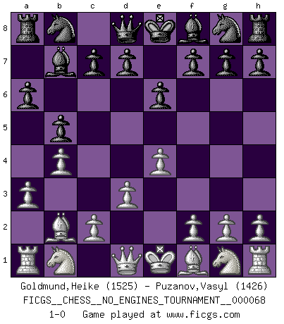 Last move : 1-0 2014 January 26 11:54:48 [Event "FICGS__CHESS__NO_ENGINES_TOURNAMENT__000068"] [Site "FICGS"] [Date "2013.12.02"] [Round "1"] [White "Goldmund,Heike"] [Black "Puzanov,Vasyl"] [Result "1-0"] [WhiteElo "1525"] [BlackElo "1426"] 1.b4 b5 2.e4 a6 3.Bb2 Bb7 4.d3 e6 5.a3 1-0 This chess game has been lost on time (started : 2013.12.02 23:28:43) Polish (Sokolsky) opening Player White won this chess game. Follow this game move after move (download)I guess a certain amount of temperament is expected of Chess geniuses. (Ron Gross) Wenn ich gewinne bin ich ein Genie. Wenn nicht, dann bin ich keines. (Robert James Fischer) ¿Se han dado cuenta de que Fischer casi nunca ha tenido piezas malas? El las intercambia y las piezas malas se quedan con sus oponenets. (Yuri Balashov) La vérité est comme le meilleur coup aux échecs : elle existe, mais il faut la chercher. (Arturo Perez-Reverte) Now the reason the enlightened prince and the wise general conquer the enemy whenever they move and their achievements surpass those of ordinary men is foreknowledge. (Sun Tzu)