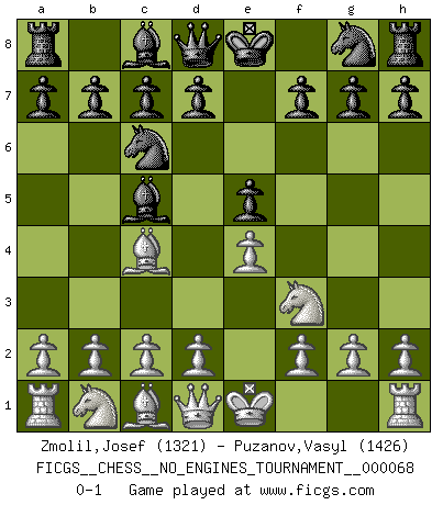 Last move : 0-1 2014 February 8 12:45:47 [Event "FICGS__CHESS__NO_ENGINES_TOURNAMENT__000068"] [Site "FICGS"] [Date "2013.12.02"] [Round "1"] [White "Zmolil,Josef"] [Black "Puzanov,Vasyl"] [Result "0-1"] [WhiteElo "1321"] [BlackElo "1426"] 1.e4 e5 2.Nf3 Nc6 3.Bc4 Bc5 0-1 Giuoco Piano Player Black won this chess game. Follow this game move after move (download)Man is a frivolous, a specious creature, and like a Chess player, cares more for the process of attaining his goal than for the goal itself. (Dostoyevsky) Sehr viele beherrschen heutzutage das große Einmalseins des Schachspiels und kennen sogar dessen Logarithmentafeln auswendig - deshalb sollte man hin und wieder zu beweisen trachten, dass zwei mal zwei auch fünf sein kann. (Mikhail Nekhemyevich Tal) Ser exitoso en el Ajedrez te permite descubrir tu propia personalidad. Eso es lo que deseo para los niños de mi clase. (Saudin Robovic) Il vaut mieux sacrifier les pièces de l'adversaire. (Xavier Tartacover) I would love to change the world, but they won't give me the source code. (Unknown)
