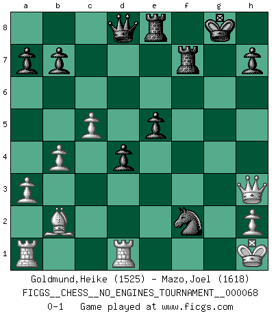 Last move : 0-1 2014 May 6 20:4:6 [Event "FICGS__CHESS__NO_ENGINES_TOURNAMENT__000068"] [Site "FICGS"] [Date "2013.12.02"] [Round "1"] [White "Goldmund,Heike"] [Black "Mazo,Joel"] [Result "0-1"] [WhiteElo "1525"] [BlackElo "1618"] 1.b4 Nf6 2.Bb2 d6 3.c4 Nbd7 4.Nf3 g6 5.e3 Bg7 6.Be2 O-O 7.O-O e5 8.d3 Re8 9.Nbd2 c6 10.Qc2 Nf8 11.a3 Be6 12.Ng5 Rc8 13.Nxe6 Nxe6 14.Nf3 Nd7 15.e4 d5 16.Rfd1 g5 17.exd5 cxd5 18.d4 e4 19.Ne5 Qc7 20.c5 Nf4 21.Bg4 Bxe5 22.dxe5 Qd8 23.e6 fxe6 24.Qc3 e5 25.Qb3 Rc7 26.Bf5 Nf6 27.f3 Nxg2 28.Kxg2 exf3+ 29.Qxf3 Rf7 30.Qh3 d4 31.Be6 g4 32.Bxg4 Nxg4 33.Kh1 Nf2+ 0-1 Polish (Sokolsky) opening Kingside Castling by player Black (move 6) Kingside Castling by player White (move 7) Player Black won this chess game. Follow this game move after move (download)Weak points or holes in the opponent's position must be occupied by pieces not Pawns. (Siegbert Tarrasch) Zu meiner Zeit war ein 20 jähriger ein junger Spieler, heute ist er ein Veteran. (Garry Kasparov) En partidas rápidas, el Caballo es mas poderoso que el Alfil. (Vlastimil Hort) Le thème de l'attaque double intervient d'une manière ou d'une autre dans l'immense majorité des combinaisons. (Youri Averbakh) A cynic is a man who knows the price of everything but the value of nothing. (Oscar Wilde)