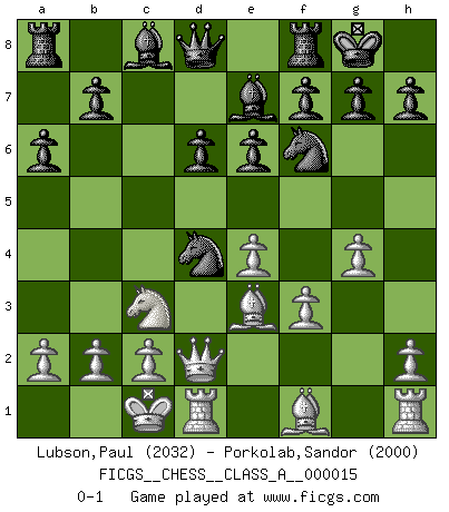 Last move : 0-1 2007 April 20 23:54:24 [Event "FICGS__CHESS__CLASS_A__000015"] [Site "FICGS"] [Date "2007.02.10"] [Round "1"] [White "Lubson,Paul"] [Black "Porkolab,Sandor"] [Result "0-1"] [WhiteElo "2032"] [BlackElo "2000"] 1.e4 c5 2.Nf3 d6 3.d4 cxd4 4.Nxd4 Nf6 5.Nc3 a6 6.Be3 e6 7.f3 Nc6 8.Qd2 Be7 9.O-O-O O-O 10.g4 Nxd4 0-1 Sicilian : Najdorf, Byrne (English) attack Queenside Castling by player White (move 9) Kingside Castling by player Black (move 9) Player Black won this chess game. Follow this game move after move (download)In Chess, just as in life, today's bliss may be tomorrow's poison. (Assaic) Ich las kürzlich ein Buch von Nietzsche. Er sagte Religion verdumme nur die Menschen. Ich stimme zu. (Robert James Fischer) Cuando le juegas a Fischer, no es una cuestion de si vas a ganar o perder. Es una cuestion de si vas a sobrevivir. (Boris Spassky) Les Cavaliers se révèlent fort utiles dans les positions fermées. D'habitude, les Fous sont un peu plus forts que les Cavaliers dans les positions ouvertes. Qu'on le veuille ou non, il restera toujours des exceptions ! The only thing that overcomes hard luck is hard work. (Harry Golden)