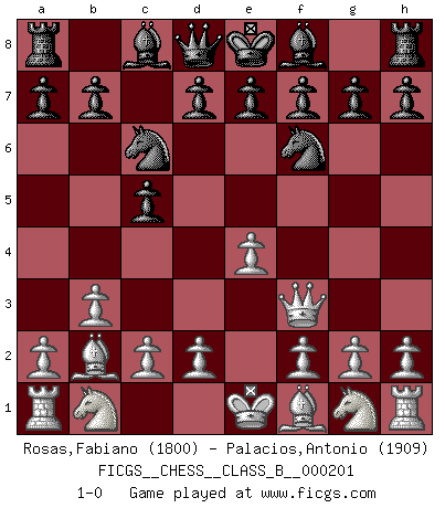 Last move : 1-0 2014 January 14 23:12:16 [Event "FICGS__CHESS__CLASS_B__000201"] [Site "FICGS"] [Date "2013.12.03"] [Round "1"] [White "Rosas,Fabiano"] [Black "Palacios,Antonio"] [Result "1-0"] [WhiteElo "1800"] [BlackElo "1909"] 1.e4 c5 2.b3 Nc6 3.Bb2 Nf6 4.Qf3 1-0 This chess game has been lost on time (started : 2013.12.03 14:50:31) Sicilian defense Player White won this chess game. Follow this game move after move (download)The sign of a great Master is his ability to win a won game quickly and painlessly. (Irving Chernev) Schach ist mein Leben, meine Leidenschaft, was ich gelernt habe und seit meinem 14. Lebensjahr profimässig praktiziere. Darauf zu verzichten, würde mir sehr schwer fallen. (Viktor Kortschnoi) Algunos sacrificios son sólidos, los demás son míos. (Mikhail Tal) On a dit que l'homme se distingue de l'animal par le fait qu'il achète plus de livres qu'il ne peut en lire. Je voudrais suggérer qu'inclure à la liste des livres quelques livres d'échecs rendrait la distinction manifeste. (Edward Lasker) It's only after you lost everything, Tyler says, that you're free to do anything. (Chuck Palahniuk, Fight Club)