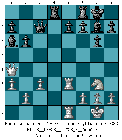 Last move : 0-1 2006 July 2 12:5:45 [Event "FICGS__CHESS__CLASS_F__000002"] [Site "FICGS"] [Date "2006.05.23"] [Round "1"] [White "Roussey,Jacques"] [Black "Cabrera,Claudio"] [Result "0-1"] [WhiteElo "1200"] [BlackElo "1200"] 1.e4 c5 2.Nf3 Nf6 3.e5 Nd5 4.c3 Nc6 5.d4 d6 6.exd6 Qxd6 7.dxc5 Qxc5 8.Bd3 g6 9.Be4 Nf6 10.Bd3 Bg7 11.O-O O-O 12.Be3 Qd6 13.Qc2 Bg4 14.Nbd2 Rac8 15.a3 Ne5 16.Nxe5 Qxe5 17.Rfe1 Qc7 18.Rac1 b6 19.Ba6 Rcd8 20.Ne4 Bf5 21.Qa4 Ng4 22.Ng3 Nxe3 23.Rxe3 Bc8 24.Rce1 Bxa6 0-1 Sicilian : Nimzovich-Rubinstein variation Kingside Castling by player White (move 11) Kingside Castling by player Black (move 11) Player Black won this chess game. Follow this game move after move (download)The passion for playing Chess is one of the most unaccountable in the world. (H.G. Wells) Mein erstes Ziel war nicht, die Partie zu gewinnen, sondern eine Figur zu opfern. -- der junge (Wilhelm Steinitz) Fischer era un maestro de claridad y un Rey del posicionamiento astuto. Sus oponentes podían ver hacia donde se dirigía pero eran impotentes para detenerlo. (Bruce Pandolfini) Votre seul travail dans les ouvertures est d'obtenir un milieu de partie jouable. (Lajos Portish) A proverb is a short sentence based on long experience. (Miguel de Cervantes)