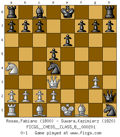 Last move : 0-1 2014 March 21 16:19:23 [Event "FICGS__CHESS__CLASS_B__000201"] [Site "FICGS"] [Date "2013.12.03"] [Round "1"] [White "Rosas,Fabiano"] [Black "Suwara,Kazimierz"] [Result "0-1"] [WhiteElo "1800"] [BlackElo "1820"] 1.e4 e6 2.Qh5 Nf6 3.Qe5 Nc6 4.Qc3 Nxe4 5.Qe3 d5 6.Nc3 Bc5 7.Qf3 Nxf2 8.Na4 Bd4 9.Ne2 Nxh1 10.Nxd4 Nxd4 11.Qd3 Qh4+ 12.g3 Qxh2 0-1 French defense Player Black won this chess game. Follow this game move after move (download)Though most people love to look at the games of the great attacking masters, some of the most successful players in history have been the quiet positional players. They slowly grind you down by taking away your space, tying up your pieces, and leaving you with virtually nothing to do ! (Yasser Seirawan) Kein Schachspieler kann gut schlafen. (H. G. Wells) En la vida, como en el Ajedrez, los Peones propios obstruyen nuestro camino. La gran fortuna de un hombre, su comodidad, placer, hijos, libros, que deberían ayudarle a ganar, con mucha frecuencia lo ponen en Jaque Mate. (Charles Buxton) Echiquier : carré parfait, comme la Jérusalem nouvelle décrite par l'auteur de l'Apocalypse, huit cases sur huit, exaltation du chiffre 4, symbole du cosmos aux quatre horizons... où le noir et le blanc, l'ombre et la lumière, le mal et le bien s'entremêlent et se conjuguent. (Robert Couffignal, Le Gambit du poète) Tree pose grows confidence. It roots me to this world. (Terri Guillemets)