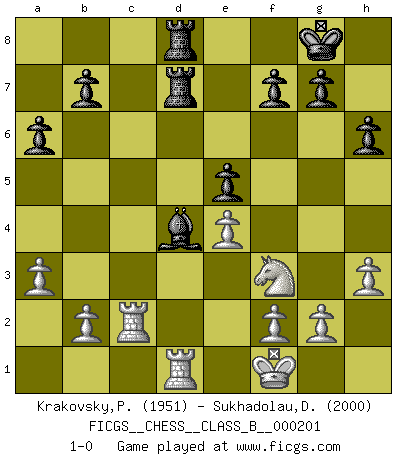 Last move : 1-0 2014 March 13 15:26:48 [Event "FICGS__CHESS__CLASS_B__000201"] [Site "FICGS"] [Date "2013.12.03"] [Round "1"] [White "Krakovsky,Peter"] [Black "Sukhadolau,Dzmitry"] [Result "1-0"] [WhiteElo "1951"] [BlackElo "2000"] 1.c4 Nf6 2.d4 e6 3.Nf3 d5 4.Nc3 Bb4 5.Bg5 h6 6.Bxf6 Qxf6 7.e3 O-O 8.Rc1 dxc4 9.Bxc4 c5 10.dxc5 Bxc5 11.O-O Qe7 12.a3 Nd7 13.Qd2 Nf6 14.e4 Rd8 15.Qe2 e5 16.h3 a6 17.Nd5 Nxd5 18.Bxd5 Bd6 19.Rfd1 Be6 20.Qe3 Bxd5 21.Rxd5 Bc7 22.Qc5 Qxc5 23.Rdxc5 Bb6 24.R5c3 Bd4 25.R3c2 Rd7 26.Kf1 Rad8 27.Rd1 1-0 English, 1...Nf6 (Anglo-Indian defense) Kingside Castling by player Black (move 7) Kingside Castling by player White (move 11) Player White won this chess game. Follow this game move after move (download)It is not enough to be a good player... you must also play well. (Siegbert Tarrasch) Sehr viele beherrschen heutzutage das große Einmalseins des Schachspiels und kennen sogar dessen Logarithmentafeln auswendig - deshalb sollte man hin und wieder zu beweisen trachten, dass zwei mal zwei auch fünf sein kann. (Mikhail Nekhemyevich Tal) El sobresalir en el Ajedrez es un signo de una mente intrigante. (Sir Arthur Conan Doyle) Ce qui est bien, c'est d'avoir tout un tas de pièces en prise : l'adversaire ne peut en prendre qu'une à la fois. Cité par Thierry Audin. They misunderestimated me. (George W. Bush, Bentonville nov. 6, 2000)