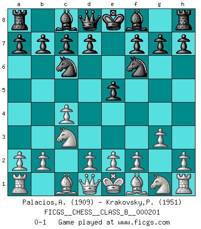 Last move : 0-1 2014 January 15 23:11:32 [Event "FICGS__CHESS__CLASS_B__000201"] [Site "FICGS"] [Date "2013.12.03"] [Round "1"] [White "Palacios,Antonio"] [Black "Krakovsky,Peter"] [Result "0-1"] [WhiteElo "1909"] [BlackElo "1951"] 1.c4 e5 2.Nc3 Nf6 3.g3 Nc6 0-1 This chess game has been lost on time (started : 2013.12.03 14:50:31) English : Carls' Bremen system Player Black won this chess game. Follow this game move after move (download)Bobby is the most misunderstood, misquoted celebrity walking the face of this earth. (Yasser Seirawan) Der Verteidiger gebe der Gewalt nach, aber nur der Gewalt. Er schaffe sich nicht freiwillig, etwa aus Blindheit oder aus Schrecken, irgendwelche Schwächen. Er lasse sich nicht bluffen. (Emanuel Lasker) El juego del Ajedrez no es solamente una diversión quieta; algunas cualidades muy valuables de la mente se pueden adquirir y cultivar con el, como convertirlos en habitos disponibles para toda ocasión; ya que la vida es algo así como el Ajedrez. (Benjamin Franklin) Les échecs sont un jeu par leur forme, un art par leur essence et une science par sa difficulté d'acquisition. Ils peuvent vous procurer autant de plaisir qu'un bon livre ou une belle musique, mais vous n'aurez une réelle joie que si vous arrivez à bien jouer. (Tigran Petrosian) When you have everything, sometimes it feels like nothing. (Horatio Caine, C.S.I. Miami)