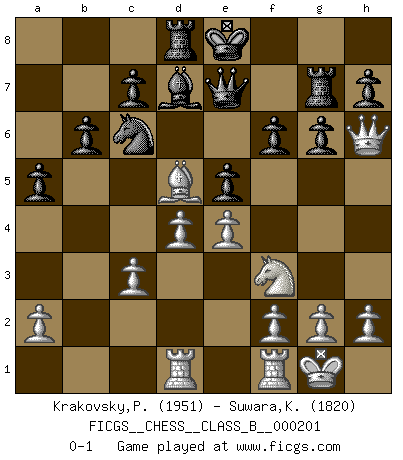 Last move : 0-1 2014 March 30 18:55:19 [Event "FICGS__CHESS__CLASS_B__000201"] [Site "FICGS"] [Date "2013.12.03"] [Round "1"] [White "Krakovsky,Peter"] [Black "Suwara,Kazimierz"] [Result "0-1"] [WhiteElo "1951"] [BlackElo "1820"] 1.c4 Nf6 2.d4 g6 3.Nc3 d5 4.cxd5 Nxd5 5.e4 Nxc3 6.bxc3 Bg7 7.Nf3 b6 8.Bb5+ Bd7 9.Be2 Nc6 10.O-O e5 11.Ba3 f6 12.Qd2 Bf8 13.Bxf8 Rxf8 14.Rad1 Qe7 15.Ba6 Rd8 16.Qh6 Rg8 17.Bc4 Rg7 18.Bd5 a5 0-1 English, 1...Nf6 (Anglo-Indian defense) Kingside Castling by player White (move 10) Player Black won this chess game. Follow this game move after move (download)I have always a slight feeling of pity for the man who has no knowledge of Chess. (Siegbert Tarrasch) Besser ein falscher Plan, logisch durchgeführt, als gar kein Plan. (Viktor Kortschnoi) La partida mas dura de ganar es una partida ganada. (Emanuel Lasker) Mais l'homme est une créature légère et illogique : semblable au joueur d'échecs, il n'aime que le processus du but à atteindre, non le but lui-même. (Dostoïevsky) No enterprise is more likely to succeed than one concealed from the enemy until it is ripe for execution. (Niccolo Machiavelli)