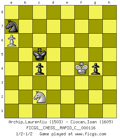 Last move : 1/2-1/2 2014 January 15 7:25:30 [Event "FICGS__CHESS__RAPID_C__000116"] [Site "FICGS"] [Date "2013.12.04"] [Round "1"] [White "Archip,Laurentiu"] [Black "Ciocan,Ioan"] [Result "1/2-1/2"] [WhiteElo "1503"] [BlackElo "1609"] 1.c4 e5 2.d4 exd4 3.Qxd4 Nc6 4.Qd1 Nf6 5.Nf3 d5 6.cxd5 Nxd5 7.a3 Be7 8.e3 O-O 9.Be2 Bg4 10.O-O Re8 11.b4 Bf6 12.Ra2 Nb6 13.Bb2 Bxb2 14.Rxb2 Qf6 15.Rd2 Rad8 16.Rxd8 Rxd8 17.Qc2 Bf5 18.Qc3 Qg6 19.Nh4 Qe6 20.Nxf5 Qxf5 21.h3 Qe5 22.Qxe5 Nxe5 23.Nc3 Kf8 24.Rd1 Rxd1+ 25.Nxd1 Nec4 26.Bxc4 Nxc4 27.a4 Ke7 28.Kf1 Ke6 29.Ke2 Kd5 30.Nc3+ Kc6 31.Kd3 Ne5+ 32.Kd4 f6 33.f4 Nd7 34.g4 a6 35.h4 Kd6 36.h5 g6 37.hxg6 hxg6 38.e4 g5 39.fxg5 fxg5 40.b5 Ne5 41.bxa6 bxa6 42.a5 Nxg4 43.Na4 Ne5 44.Nc5 g4 45.Nxa6 Nc4 46.e5+ Nxe5 47.Ke4 c5 48.Ke3 c4 49.Nb4 Nc6 50.a6 Na7 51.Kf4 Kc5 52.Nc2 1/2-1/2 English Opening Kingside Castling by player Black (move 8) Kingside Castling by player White (move 10) 10 pieces endgame at move 41 : White KNPPP , Black KNPPP WHITE : King + 1 Knight 3 Pawns BLACK : King + 1 Knight 3 Pawns 9 pieces endgame at move 42 : White KNPP , Black KNPPP WHITE : King + 1 Knight 2 Pawns BLACK : King + 1 Knight 3 Pawns 8 pieces endgame at move 45 : White KNPP , Black KNPP WHITE : King + 1 Knight 2 Pawns BLACK : King + 1 Knight 2 Pawns 7 pieces endgame at move 46 : White KNP , Black KNPP WHITE : King + 1 Knight 1 Pawn BLACK : King + 1 Knight 2 Pawns This chess game ended in a draw. Follow this game move after move (download)The passed Pawn is a criminal, who should be kept under lock and key. Mild measures, such as police surveillance, are not sufficient. (Aaron Nimzovich) Rubinstein ist ein Turmendspiel, welches die Götter vor tausenden von Jahren begannen. (Savielly Grigorievitsch Tartakower) Yo creo que el Ajedrez posee una magia que es también una ayuda en la edad avanzada. Una rodilla reumática es olvidada durante una partida de Ajedrez y otros eventos pueden parecer algo sin importancia comparada a una catástrofe en el tablero de Ajedrez. (Vlastimil Hort) Il vaut mieux sacrifier les pièces de l'adversaire. (Xavier Tartacover) Be who you are, and say what you feel because those who mind don't matter, and those who matter don't mind. (Dr Seuss)