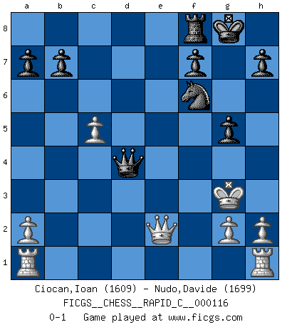 Last move : 0-1 2014 January 9 22:47:4 [Event "FICGS__CHESS__RAPID_C__000116"] [Site "FICGS"] [Date "2013.12.04"] [Round "1"] [White "Ciocan,Ioan"] [Black "Nudo,Davide"] [Result "0-1"] [WhiteElo "1609"] [BlackElo "1699"] 1.d4 Nf6 2.c4 e6 3.Nc3 Bb4 4.Qc2 c5 5.e3 Nc6 6.Nf3 d5 7.cxd5 exd5 8.dxc5 O-O 9.Bd3 Bg4 10.Be2 d4 11.Nxd4 Nxd4 12.exd4 Bxe2 13.Qxe2 Qxd4 14.Qc2 Rae8+ 15.Be3 Rxe3+ 16.fxe3 Qxe3+ 17.Qe2 Bxc3+ 18.bxc3 Qxc3+ 19.Kf2 Qd4+ 20.Kg3 g5 0-1 Nimzo-Indian : Classical, 4...c5 Kingside Castling by player Black (move 8) Player Black won this chess game. Follow this game move after move (download)The defensive power of a pinned piece is only imaginary. (Aaron Nimzovich) Ivan Sokolov treibt mich als Beifahrer an mit go Loeky go - . (Loek van Wely) El muchacho (en ese entonces un niño de 12 años llamado Anatoly Karpov) no tiene ni idea de lo que es el Ajedrez y no hay futuro en absoluto para el en esta profesión. (Mikhail Botvinnik) Les Echecs mettent en conflit, non pas deux intelligences, mais deux volontés. (Lasker) All politicians must be presumed guilty until they are proven innocent. (Dinesh De Silva)