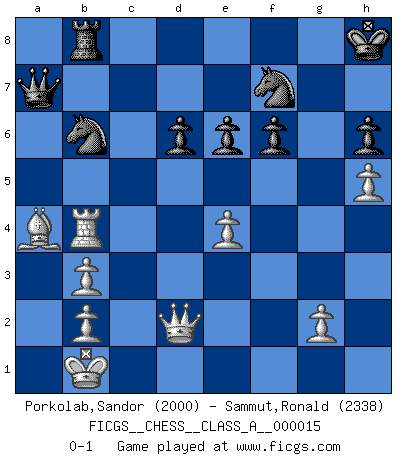 Last move : 0-1 2007 September 30 21:57:38 [Event "FICGS__CHESS__CLASS_A__000015"] [Site "FICGS"] [Date "2007.02.10"] [Round "1"] [White "Porkolab,Sandor"] [Black "Sammut,Ronald"] [Result "0-1"] [WhiteElo "2000"] [BlackElo "2338"] 1.e4 c5 2.Nf3 d6 3.d4 cxd4 4.Nxd4 Nf6 5.Nc3 a6 6.Bg5 e6 7.f4 Be7 8.Qf3 Qc7 9.O-O-O Nbd7 10.f5 Ne5 11.Qg3 b5 12.a3 Rb8 13.Be2 O-O 14.h4 Kh8 15.fxe6 fxe6 16.h5 h6 17.Bh4 b4 18.axb4 Rxb4 19.Qe3 Bd7 20.Rhf1 Kg8 21.Nb3 a5 22.Rd4 Rfb8 23.Qg3 Kh8 24.Qh3 R4b6 25.Kb1 Qa7 26.Bf2 a4 27.Nxa4 Bxa4 28.Rb4 Bxb3 29.cxb3 Nfd7 30.Qc3 Bf6 31.Bxb6 Nxb6 32.Bb5 Qa5 33.Rxf6 gxf6 34.Ba4 Qa7 35.Qd2 Nf7 0-1 Sicilian : Najdorf, 7...Be7 Queenside Castling by player White (move 9) Kingside Castling by player Black (move 13) Player Black won this chess game. Follow this game move after move (download)Chess is in its essence a game, in its form an art, and in its execution a science. (Baron Tassilo) Bogoljubow: Matt in vier Zügen! Tartakower: Ich verbitte mir jede Belästigung! (Savielly Grigorievitsch Tartakower) Muchos se han convertido en Maestros de Ajedrez, nadie se ha convertido en el Maestro del Ajedrez. (Siegbert Tarrasch) La vérité est comme le meilleur coup aux échecs : elle existe, mais il faut la chercher. (Arturo Perez-Reverte) Opportunities multiply as they are seized. (Sun Tzu)