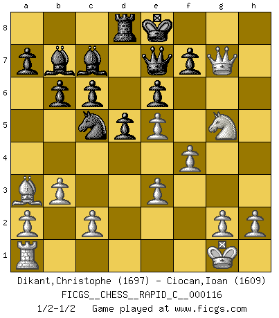 Last move : 1/2-1/2 2014 February 25 17:59:46 [Event "FICGS__CHESS__RAPID_C__000116"] [Site "FICGS"] [Date "2013.12.04"] [Round "1"] [White "Dikant,Christophe"] [Black "Ciocan,Ioan"] [Result "1/2-1/2"] [WhiteElo "1697"] [BlackElo "1609"] 1.d4 d5 2.Nf3 c6 3.b3 Nf6 4.Bb2 e6 5.e3 Bd6 6.Bd3 O-O 7.Nbd2 Re8 8.O-O Nbd7 9.Ne5 Bc7 10.f4 Nxe5 11.dxe5 Nd7 12.Rf3 Nc5 13.Bxh7+ Kxh7 14.Rh3+ Kg8 15.Qh5 Kf8 16.Qh8+ Ke7 17.Qxg7 Rg8 18.Qf6+ Ke8 19.Rh8 Rxh8 20.Qxh8+ Kd7 21.Qg7 Qe7 22.Ba3 b6 23.Nf3 Bb7 24.Ng5 Rf8 25.Nh7 Rd8 26.Ng5 Ke8 27.Nh7 Kd7 28.Ng5 Ke8 1/2-1/2 Queen's pawn game Kingside Castling by player Black (move 6) Kingside Castling by player White (move 8) This chess game ended in a draw. Follow this game move after move (download)Some sacrifices are sound; the rest are mine. (Mikhail Tal) Woher wissen wir, daß der Neanderthaler Blindschach gespielt hat? -- Bei Ausgrabungen wurden keine Schachbretter und Figuren gefunden. (Anonymous) Una buena ofensiva y una buena defensa, comienzan ambas con un buen desarrollo. (Bruce A. Moon) Nous vivons dans un monde échiquéen : chaque jour qui passe est un défi à relever. (Philosophe Sasha) I'm extremely disappointed. I send you out for exciting, new designer drugs, you come back with tomato sauce. (Gregory House, House M.D.)