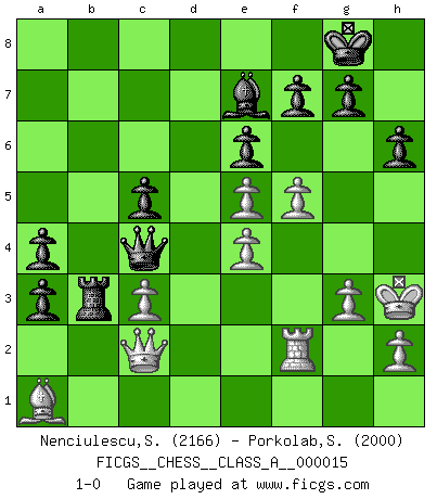 Last move : 1-0 2007 December 27 9:56:39 [Event "FICGS__CHESS__CLASS_A__000015"] [Site "FICGS"] [Date "2007.02.10"] [Round "1"] [White "Nenciulescu,Silviu"] [Black "Porkolab,Sandor"] [Result "1-0"] [WhiteElo "2166"] [BlackElo "2000"] 1.d4 Nf6 2.c4 e6 3.Nf3 b6 4.a3 Bb7 5.Nc3 d5 6.cxd5 Nxd5 7.Qc2 Nxc3 8.bxc3 Nd7 9.e4 c5 10.Bd3 Qc7 11.Qb1 Be7 12.O-O h6 13.a4 O-O 14.Ba3 Nf6 15.a5 bxa5 16.Qe1 Rab8 17.Ne5 Nd7 18.f4 Nxe5 19.dxe5 Bc6 20.Qe3 Rfd8 21.Be2 a4 22.Rfe1 Bb5 23.Rf1 Bxe2 24.Qxe2 Qa5 25.Rf3 Rb3 26.Qc2 Qb6 27.Rf2 Rb8 28.g3 Rb1+ 29.Rxb1 Qxb1+ 30.Kg2 Qb3 31.Qc1 Qc4 32.Qc2 Rb3 33.Bb2 a3 34.Ba1 a5 35.Kh3 a4 36.f5 1-0 This chess game has been lost on time (started : 2007.02.10 23:13:59) Queen's Indian : Petrosian system Kingside Castling by player White (move 12) Kingside Castling by player Black (move 13) Player White won this chess game. Follow this game move after move (download)If your opponent offers you a draw, try to work out why he thinks he's worse off. (Nigel Short) Wie, soll nun auch die Opposition abgeschafft werden? Ja, es tut mir leid, Ihnen diesen Schmerz nicht ersparen zu können. (Aaron Nimzowitsch) No hay precio que sea tan grande por la cabellera del Rey enemigo. (Koblentz) A chaque perte on perd un peu de soi. (Joël Lautier) I have opinions of my own - strong opinions - but I don't always agree with them. (George Bush)