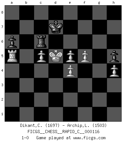 Last move : 1-0 2014 February 26 5:59:29 [Event "FICGS__CHESS__RAPID_C__000116"] [Site "FICGS"] [Date "2013.12.04"] [Round "1"] [White "Dikant,Christophe"] [Black "Archip,Laurentiu"] [Result "1-0"] [WhiteElo "1697"] [BlackElo "1503"] 1.d4 d5 2.Nf3 Nf6 3.b3 e6 4.Bb2 Ne4 5.e3 Bb4+ 6.c3 Be7 7.Bd3 Nf6 8.Nbd2 c5 9.O-O Nc6 10.Ne5 Nxe5 11.dxe5 Nd7 12.f4 a6 13.a4 O-O 14.Rf3 f6 15.Rh3 h6 16.Qg4 f5 17.Qg6 Qe8 18.Qxe6+ Qf7 19.Bxf5 Qxe6 20.Bxe6+ Kh8 21.c4 dxc4 22.bxc4 Nb6 23.Bxc8 Raxc8 24.a5 Nd7 25.Ne4 Nb8 26.Rd1 Nc6 27.Bc3 Rcd8 28.Nd6 Rb8 29.Rb1 Rfd8 30.Nf7+ Kg8 31.Nxd8 Bxd8 32.Ra1 Nb4 33.e4 b6 34.axb6 Rxb6 35.Bxb4 cxb4 36.Rb3 Be7 37.Kf2 Bc5+ 38.Kf3 Bd4 39.Ra5 Bc3 40.Ke2 Rc6 41.Kd3 Kf7 42.Rxc3 bxc3 43.Kxc3 Ke6 44.c5 g5 45.g3 gxf4 46.gxf4 h5 47.h4 Ke7 48.Kc4 Ke6 49.Kd4 Ke7 50.Kd5 Kd7 51.f5 1-0 Queen's pawn game Kingside Castling by player White (move 9) Kingside Castling by player Black (move 13) Player White won this chess game. Follow this game move after move (download)We cannot resist the fascination of sacrifice, since a passion for sacrifices is part of a Chessplayer's nature. (Rudolf Spielman) Schach ist das Spiel, das die Verrückten gesund hält. (Albert Einstein) El Ajedrez es un mar en el cual un mosquito puede beber y un elefante puede bañarse. (Refrán Hindú) Les échecs sont un jeu par leur forme, un art par leur essence et une science par sa difficulté d'acquisition. Ils peuvent vous procurer autant de plaisir qu'un bon livre ou une belle musique, mais vous n'aurez une réelle joie que si vous arrivez à bien jouer. (Tigran Petrosian) He who fights with monsters should be careful lest he thereby become a monster. (Friedrich Nietzsche, Beyond Good and Evil)
