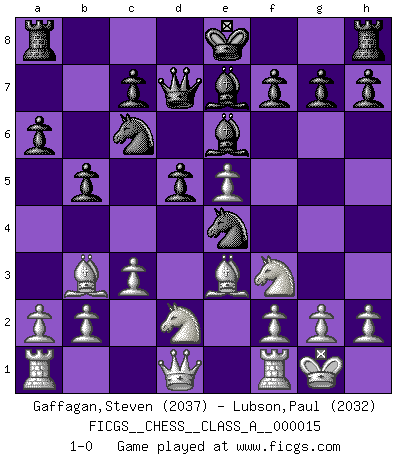 Last move : 1-0 2007 April 18 11:31:34 [Event "FICGS__CHESS__CLASS_A__000015"] [Site "FICGS"] [Date "2007.02.10"] [Round "1"] [White "Gaffagan,Steven"] [Black "Lubson,Paul"] [Result "1-0"] [WhiteElo "2037"] [BlackElo "2032"] 1.e4 e5 2.Nf3 Nc6 3.Bb5 a6 4.Ba4 Nf6 5.O-O Nxe4 6.d4 b5 7.Bb3 d5 8.dxe5 Be6 9.Be3 Be7 10.c3 Qd7 11.Nbd2 1-0 Ruy Lopez : Open, 7.Bb3 Kingside Castling by player White (move 5) Player White won this chess game. Follow this game move after move (download)Chess is war over the board. The object is to crush the opponents mind. (Bobby Fischer) Pläne sind die Träume des Verständigen. (Ernst Freiherr von Feuchtersleben) Yo tuve un dolor de muelas en la primer partida. En el segundo juego, tuve un dolor de cabeza. En el tercero, tuve un ataque de reumatísmo. En la cuarta partida, no me sentía muy bien. ¿Y en el quinto juego? Bueno, ¿que acaso uno tiene que ganar todos los juegos?. (Siegbert Tarrasch) On a dit que l'homme se distingue de l'animal par le fait qu'il achète plus de livres qu'il ne peut en lire. Je voudrais suggérer qu'inclure à la liste des livres quelques livres d'échecs rendrait la distinction manifeste. (Edward Lasker) Depression is just anger without enthusiasm. (Unknown)