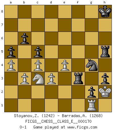 Last move : 0-1 2013 December 10 14:56:19 [Event "FICGS__CHESS__CLASS_E__000170"] [Site "FICGS"] [Date "2013.12.05"] [Round "1"] [White "Stoyanov,Zdravko"] [Black "Barradas,Anderson"] [Result "0-1"] [WhiteElo "1242"] [BlackElo "1268"] 1.e4 c5 2.Nf3 d6 3.h3 a6 4.a3 e5 5.d3 Nf6 6.Bg5 Be7 7.Be2 h6 8.Bh4 Nfd7 9.Bxe7 Qxe7 10.O-O O-O 11.c4 Nc6 12.Nc3 Nb6 13.a4 a5 14.Qb3 Nb4 15.Nb5 Be6 16.Nh2 Qg5 17.Bg4 Bxg4 18.Nxg4 Nd7 19.Nxd6 b6 20.Nf5 Nf6 21.Nxe5 Nh5 22.Qd1 Nf4 23.Qf3 Rad8 24.Rad1 Nc2 25.Nc6 Rde8 26.Nce7+ Kh8 27.Qg4 g6 28.Qxg5 hxg5 29.Nxg6+ fxg6 30.Nd6 Re5 31.b3 Rf6 32.Nb5 Ne2+ 33.Kh2 g4 34.h4 Rh5 35.g3 g5 36.Kg2 gxh4 37.Rh1 h3+ 38.Kf1 Nxg3+ 39.Kg1 Nxh1 40.Kxh1 Rxf2 41.Rg1 Ne3 42.Rg3 Rf3 43.Rg1 g3 44.Nc3 g2+ 45.Kh2 Ng4+ 0-1 Sicilian Kingside Castling by player White (move 10) Kingside Castling by player Black (move 10) Player Black won this chess game. Follow this game move after move (download)Chess is mental torture. (Garry Kasparov) Ich verstehe Aljechins Kombinationen ganz gut; aber woher er diese Angriffschancen bekommt und wie er die Eröffnung behandelt das ist für mich ein Buch mit sieben Siegeln. (Rudolf Spielmann) El Ajedrez es un juego terrible. Si no dominas el centro, tu oponente tiene una posición mas libre. Si tu tienes el centro, entonces realmente tienes algo de que preocuparte. (Siegbert Tarrasch) Le plus grand jeu de l'esprit jamais inventé, plus vous l'apprenez, plus vous y prenez du plaisir. (Garry Kasparov) The smarter you play, the luckier you'll be. (Mark Pilarski)