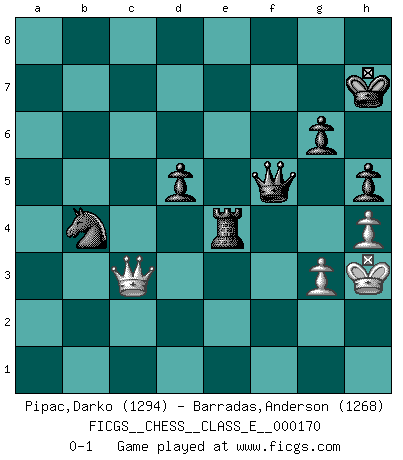 Last move : 0-1 2013 December 19 21:29:36 [Event "FICGS__CHESS__CLASS_E__000170"] [Site "FICGS"] [Date "2013.12.05"] [Round "1"] [White "Pipac,Darko"] [Black "Barradas,Anderson"] [Result "0-1"] [WhiteElo "1294"] [BlackElo "1268"] 1.e4 c5 2.Nf3 d6 3.h3 a6 4.Nc3 Bd7 5.d4 cxd4 6.Nxd4 e5 7.Nf5 Nf6 8.Bg5 Bxf5 9.Bd3 Bg6 10.Nd5 Be7 11.Bxf6 Bxf6 12.O-O O-O 13.b3 Nd7 14.c4 Nc5 15.Re1 Bh4 16.Qg4 Nxd3 17.Re2 h5 18.Qf3 Nc5 19.g3 Bg5 20.h4 Bh6 21.a4 f5 22.exf5 Rxf5 23.Qg2 Nxb3 24.Rb1 Nd4 25.Reb2 b5 26.cxb5 axb5 27.axb5 Ra5 28.Ne3 Rf7 29.b6 Bxb1 30.Rxb1 Rb5 31.Rxb5 Nxb5 32.b7 Bxe3 33.fxe3 d5 34.Qb2 Rxb7 35.Qxe5 g6 36.Kg2 Re7 37.Qf4 Kg7 38.Qb4 Na7 39.Qd4+ Kh7 40.e4 Nc6 41.Qd3 Rxe4 42.Kh3 Nb4 43.Qf3 Qd7+ 44.Kh2 Qf5 45.Qc3 Qf2+ 46.Kh3 Qf5+ 0-1 Sicilian Kingside Castling by player White (move 12) Kingside Castling by player Black (move 12) Player Black won this chess game. Follow this game move after move (download)The combination player thinks forward; he starts from the given position, and tries the forceful moves in his mind. (Emanuel Lasker) Wenn du gegen Bobby spielst, ist es keine Frage von gewinnen oder verlieren. Es ist eine Frage des Überlebens. (Boris Vassilievich Spassky) Existen dos clases de sacrificios: los correctos y los míos. (Mikhail Tal) L'attaque fait le spectacle, la défense gagne les matchs. (Dicton footballistique) There is no vagueness without wind. (Chinese proverb)