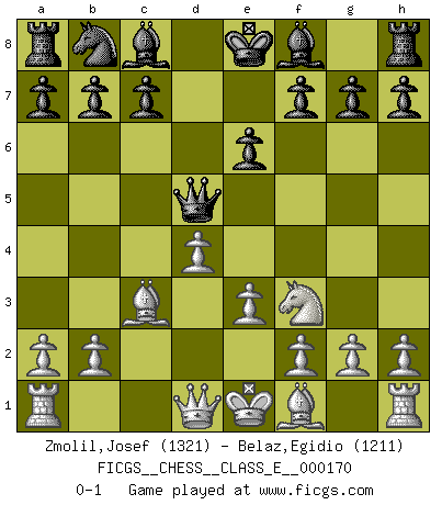 Last move : 0-1 2014 February 16 18:28:59 [Event "FICGS__CHESS__CLASS_E__000170"] [Site "FICGS"] [Date "2013.12.05"] [Round "1"] [White "Zmolil,Josef"] [Black "Belaz,Egidio"] [Result "0-1"] [WhiteElo "1321"] [BlackElo "1211"] 1.d4 d5 2.c4 Nf6 3.cxd5 Qxd5 4.Nc3 Qa5 5.Nf3 Nd5 6.Bd2 Nxc3 7.Bxc3 Qd5 8.e3 e6 0-1 This chess game has been lost on time (started : 2013.12.05 17:26:47) QGD : Marshall defense Player Black won this chess game. Follow this game move after move (download)Modern Chess is too much concerned with things like Pawn structure. Forget it, Checkmate ends the game. (Nigel Short) Ich suche im Schach immer etwas Eigenes. Riskantes Spiel im Stile schachlicher Musketiere ist nicht meine Sache, auch wenn es vielen Freunden scharfer Wendungen gefällt. (Anatoly Karpov) El Ajedrez tiene tanto misterio como las mujeres. (Purdy) Le profane ne songe pas à la somme de jouissance dont il se prive, qui méconnaît ce jeu aux ressources aussi variées que passionnantes. (Jean-Marie Jeanton-Lamarche) He who is a good ruler must first have been ruled. (Aristotle)
