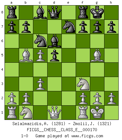 Last move : 1-0 2014 February 24 1:38:17 [Event "FICGS__CHESS__CLASS_E__000170"] [Site "FICGS"] [Date "2013.12.05"] [Round "1"] [White "Selalmazidis,Arsenis"] [Black "Zmolil,Josef"] [Result "1-0"] [WhiteElo "1281"] [BlackElo "1321"] 1.e4 c5 2.Nf3 Nc6 3.Bb5 e6 4.c3 d5 5.exd5 exd5 6.O-O Bd6 7.d4 Nge7 8.Bg5 O-O 9.dxc5 1-0 This chess game has been lost on time (started : 2013.12.05 17:26:47) Sicilian : Nimzovich-Rossolimo attack (without ...d6) Kingside Castling by player White (move 6) Kingside Castling by player Black (move 8) Player White won this chess game. Follow this game move after move (download)If one piece is badly posted, the whole game is bad. (Tarrasch) Frage: Was machen Sie mit den Preisen? Anwort: Ich habe Angst, dass meine Freundin davon neue Kleider kauft. (Loek van Wely) Aunque la mayoría de la gente disfruta observar las partidas de los grandes Maestros de ataque, algunos de los jugadores mas notables en la historia han sido los jugadores silenciosos posicionales. Lentamente ellos te aplastan despojandote de tu espacio, congestionando tus piezas y dejandote virtualmente sin nada que hacer. (Yasser Seirawan) C'est la seule position que je connaisse où les deux camps sont mals. Propos prêtés à V. Anand. I would love to change the world, but they won't give me the source code. (Unknown)