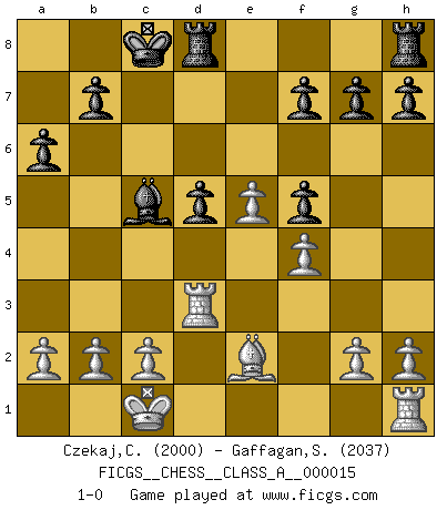 Last move : 1-0 2007 June 3 6:12:36 [Event "FICGS__CHESS__CLASS_A__000015"] [Site "FICGS"] [Date "2007.02.10"] [Round "1"] [White "Czekaj,Christophe"] [Black "Gaffagan,Steven"] [Result "1-0"] [WhiteElo "2000"] [BlackElo "2037"] 1.e4 c6 2.d4 d5 3.e5 Bf5 4.Nf3 e6 5.Be2 c5 6.Be3 cxd4 7.Nxd4 Ne7 8.Bg5 Qb6 9.Nc3 Nbc6 10.Ncb5 Nxd4 11.Qxd4 Qxd4 12.Nxd4 a6 13.Bxe7 Bxe7 14.Nxf5 exf5 15.O-O-O O-O-O 16.f4 Bc5 17.Rd3 1-0 This chess game has been lost on time (started : 2007.02.10 23:13:59) Caro-Kann : Advance variation Queenside Castling by player White (move 15) Queenside Castling by player Black (move 15) Player White won this chess game. Follow this game move after move (download)When the Chess game is over, the Pawn and the King go back to the same box. (Irish saying) Früher wurde jeder komplizierte Zug, jedes interessante Opfer mit großem Beifall und Enthusiasmus aufgenommen. Heute schaltet man einfach seinen Fritz an, und man kann sehen, was los ist, ob der Zug geht oder nicht. (Vladimir Kramnik) Los problemas de Ajedrez exigen del compositor las mismas virtudes que caracterizan todo el arte de valor: originalidad, invención, concisión, armonía, complejidad e insinceridad explendida. (Vladimir Nabokov) Plusieurs personnes se sont demandées comment Tal faisait pour gagner... En fait, c'est très simple ! Il met ses pièces au centre de l'échiquier et les sacrifie quelque part ! (David Bronstein) As the days dwindle down... to a precious few. (Maxwell Anderson)