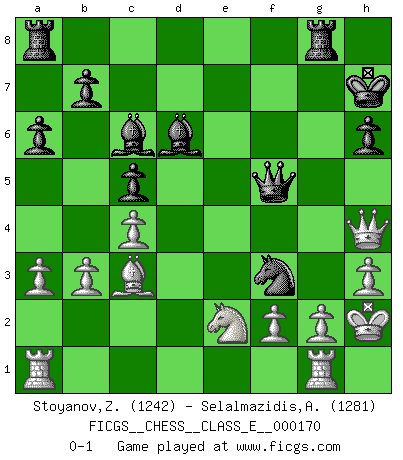 Last move : 0-1 2014 January 30 19:29:35 [Event "FICGS__CHESS__CLASS_E__000170"] [Site "FICGS"] [Date "2013.12.05"] [Round "1"] [White "Stoyanov,Zdravko"] [Black "Selalmazidis,Arsenis"] [Result "0-1"] [WhiteElo "1242"] [BlackElo "1281"] 1.e4 e5 2.Nf3 Nc6 3.Bb5 a6 4.Bxc6 dxc6 5.h3 Nf6 6.d3 Bd6 7.O-O h6 8.a3 O-O 9.Nc3 c5 10.Be3 Kh7 11.Ne2 Be6 12.Ng3 Qd7 13.Kh2 g6 14.Ng1 Ng8 15.Qf3 f5 16.exf5 gxf5 17.Bd2 c4 18.Rfe1 c6 19.dxc4 Bxc4 20.b3 Bd5 21.Qh5 f4 22.N3e2 Qg7 23.Nf3 Nf6 24.Qh4 Nd7 25.c4 Rg8 26.Rg1 Qg6 27.Bb4 c5 28.Bc3 Bc6 29.Nxe5 Nxe5 30.Nxf4 Qf5 31.Ne2 Nf3+ 0-1 Ruy Lopez : Exchange variation Kingside Castling by player White (move 7) Kingside Castling by player Black (move 8) Player Black won this chess game. Follow this game move after move (download)All my games are real. (Bobby Fischer) Heutzutage gewinnt im Turnier nicht derjenige Spieler, der weitreichende Pläne entwirft, sondern einfach jener, der Zug um Zug kämpft. (David Bronstein) La última cosa en que Fischer estaba interesado era en tonterías, siempre y cuando el Ajedrez estuviera involucrado. (Elie Agur) J'ai toujours senti une vague pitié pour l'homme qui ne connaît rien aux échecs, tout comme j'en aurais pour un homme ignorant de l'amour. Les Echecs, comme la musique ou comme l'amour, ont le pouvoir de rendre heureux. (Siegbert Tarrasch) Live, lose, and learn, by observing your opponent how to win. (Amber Steenbock)