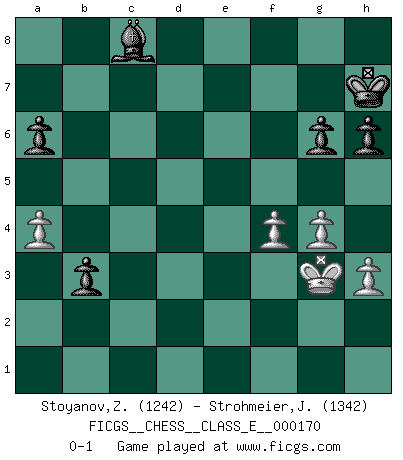 Last move : 0-1 2014 May 28 6:11:22 [Event "FICGS__CHESS__CLASS_E__000170"] [Site "FICGS"] [Date "2013.12.05"] [Round "1"] [White "Stoyanov,Zdravko"] [Black "Strohmeier,Josef"] [Result "0-1"] [WhiteElo "1242"] [BlackElo "1342"] 1.e4 c5 2.Nf3 Nc6 3.Bb5 g6 4.Bxc6 bxc6 5.h3 Bg7 6.O-O d6 7.Re1 Qc7 8.c3 Nf6 9.d3 O-O 10.Nbd2 Ba6 11.c4 Nd7 12.Rb1 Rab8 13.b3 Bc8 14.Ng5 h6 15.Ngf3 Nb6 16.Nf1 Bb7 17.Ne3 e6 18.Bb2 Rbd8 19.Bxg7 Kxg7 20.Qc1 d5 21.cxd5 cxd5 22.Nd4 Qe7 23.Nb5 a6 24.Na3 dxe4 25.Qc3+ Kg8 26.Rbd1 exd3 27.Rxd3 Rxd3 28.Qxd3 Rd8 29.Qe2 Nd5 30.Nac4 Bc6 31.Na5 Bb5 32.Qf3 Qc7 33.Nac4 Kg7 34.Nxd5 exd5 35.Ne5 Re8 36.Qxd5 Rd8 37.Qf3 Re8 38.Qc3 Kg8 39.a4 Bd7 40.f4 Be6 41.g4 Bc8 42.Nxg6 Rxe1+ 43.Qxe1 fxg6 44.Qc1 Kh7 45.b4 c4 46.Kf2 Qb6+ 47.Kg3 Qxb4 48.Qc2 Qb3+ 49.Qxb3 cxb3 0-1 Sicilian : Nimzovich-Rossolimo attack (with ...g6, without ...d6) Kingside Castling by player White (move 6) Kingside Castling by player Black (move 9) Player Black won this chess game. Follow this game move after move (download)I'd rather have a Pawn than a finger. (Reuben Fine) Man kann eine Schachpartie nur gewinnen, wenn das Gleichgewicht gestört ist. In einer Stellung mit ungestörtem Gleichgewicht ist auch das größte Genie hilflos - in der Stellung steckt dann eben kein genialer Einfall. (Wilhelm Steinitz) Cualquier cambio de material en una posición debe venir por medio de un mate, una captura o promoción de Peón. (Purdy) Le jeu d'échecs fait naître et fortifie en nous plusieurs qualités précieuses dans le cours de l'existence, telles que la prévoyance, la circonspection, la prudence, et la persévérance. (Benjamin Franklin - 1783, la morale des échecs) In every real man a child is hidden that wants to play. (Friedrich Nietzsche)
