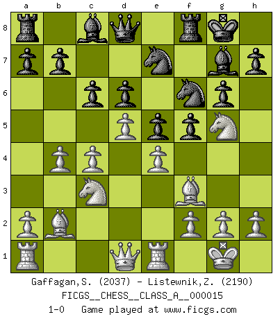 Last move : 1-0 2007 June 12 13:9:19 [Event "FICGS__CHESS__CLASS_A__000015"] [Site "FICGS"] [Date "2007.02.10"] [Round "1"] [White "Gaffagan,Steven"] [Black "Listewnik,Zbigniew"] [Result "1-0"] [WhiteElo "2037"] [BlackElo "2190"] 1.c4 Nf6 2.Nc3 g6 3.e4 d6 4.d4 Bg7 5.Be2 O-O 6.Nf3 e5 7.O-O Nc6 8.d5 Ne7 9.b4 Nh5 10.Re1 f5 11.Ng5 Nf6 12.Bf3 c6 13.Bb2 1-0 English Opening Kingside Castling by player Black (move 5) Kingside Castling by player White (move 7) Player White won this chess game. Follow this game move after move (download)I have added these principles to the law: get the Knights into action before both Bishops are developed. (Emanuel Lasker) Im Schach gewinnt jeder. Hat man Freunde am Spiel - und das ist die Hauptsache - ist auch der Verlust einer Partie kein Unglück. (David Bronstein) Robert Fischer es la ley hacia si mismo. (Larry Evans) Comme les marins qui ont mille raisons différentes d'aller en mer, les joueurs d'échecs en ont tout autant avant de s'installer devant une table et jouer... (Vincent Bertignac, philosophe) Wikichess, chess moves explained by 'experimented' players. (Thibault de Vassal)