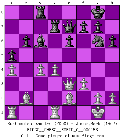 Last move : 0-1 2014 February 16 1:14:22 [Event "FICGS__CHESS__RAPID_A__000153"] [Site "FICGS"] [Date "2013.12.05"] [Round "1"] [White "Sukhadolau,Dzmitry"] [Black "Josse,Mark"] [Result "0-1"] [WhiteElo "2000"] [BlackElo "1907"] 1.d4 Nf6 2.c4 e6 3.Nc3 Bb4 4.Qc2 d5 5.a3 Bxc3+ 6.Qxc3 O-O 7.e3 b6 8.Nf3 Bb7 9.b3 Nbd7 10.Be2 c5 11.O-O Rc8 12.Bb2 Ne4 13.Qd3 Qe7 14.Rfd1 Rfd8 15.a4 a5 16.Nd2 Nxd2 17.Qxd2 h6 18.f3 cxd4 19.exd4 dxc4 20.bxc4 Ne5 21.Rac1 Bc6 22.Qe3 Ng6 23.Ra1 Rd7 0-1 This chess game has been lost on time (started : 2013.12.05 23:0:53) Nimzo-Indian : Classical, Noa variation, 5.a3 Kingside Castling by player Black (move 6) Kingside Castling by player White (move 11) Player Black won this chess game. Follow this game move after move (download)Help your pieces so they can help you. (Paul Morphy) Fischer ist das größte Genie, das je vom Schachhimmel heruntergestiegen ist. (Mikhail Nekhemyevich Tal) De eso se trata el Ajedrez. Un día le das una lección a tu oponente y al día siguiente el te da una a tí. (Bobby Fischer) Les écrivains ont utilisé les échecs pour analyser les côtés extrêmes de la nature humaine. Dans ce cadre, les échecs offrent un champ d'expérimentation idéal. Mais on pourrait faire la même chose avec la peinture. Et là, en vous référant à Van Gogh, vous ne tirerez pas de conclusion définitive sur les peintres. (Gary Kasparov) Chess is as much a mystery as women. (Purdy)