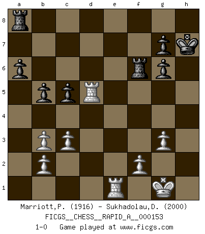 Last move : 1-0 2014 March 5 14:56:36 [Event "FICGS__CHESS__RAPID_A__000153"] [Site "FICGS"] [Date "2013.12.05"] [Round "1"] [White "Marriott,Peter"] [Black "Sukhadolau,Dzmitry"] [Result "1-0"] [WhiteElo "1916"] [BlackElo "2000"] 1.e4 e5 2.Nf3 Nc6 3.Bb5 a6 4.Ba4 Nf6 5.O-O Nxe4 6.d4 b5 7.Bb3 d5 8.dxe5 Be6 9.Nbd2 Nc5 10.c3 Be7 11.Bc2 d4 12.Nb3 d3 13.Bb1 Nxb3 14.axb3 Bf5 15.Be3 O-O 16.Bd4 Qd5 17.Re1 d2 18.Re2 Bxb1 19.Rxb1 Nxd4 20.Nxd4 Bg5 21.g3 c5 22.Nf5 Qd3 23.Nd6 Qg6 24.h4 Bxh4 25.Rxd2 Be7 26.Ra1 f6 27.Qf3 fxe5 28.Qd5+ Kh8 29.Qxe5 Bg5 30.Rd5 Bf4 31.Qe4 Bxd6 32.Qxg6 hxg6 33.Rxd6 Rf6 34.Rd5 Kh7 35.Re1 1-0 This chess game has been lost on time (started : 2013.12.05 23:0:53) Ruy Lopez : Open, 7.Bb3 Kingside Castling by player White (move 5) Kingside Castling by player Black (move 15) Player White won this chess game. Follow this game move after move (download)Play the opening like a book, the middle game like a magician, and the endgame like a machine. (Spielmann) Karpov ist ein Museumsstück. (Garry Kasparov) Tu cuerpo tiene que estar en óptima condición. Tu Ajedrez se deteriora como lo hace tu cuerpo. No puedes separar la mente y el cuerpo. (Bobby Fischer) Nous vivons dans un monde échiquéen : chaque jour qui passe est un défi à relever. (Philosophe Sasha) Good decisions come from experience, and experience comes from bad decisions. (Anonymous)