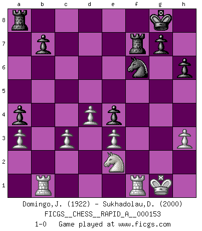 Last move : 1-0 2014 February 28 2:19:35 [Event "FICGS__CHESS__RAPID_A__000153"] [Site "FICGS"] [Date "2013.12.05"] [Round "1"] [White "Domingo,Jordi"] [Black "Sukhadolau,Dzmitry"] [Result "1-0"] [WhiteElo "1922"] [BlackElo "2000"] 1.g4 d5 2.h3 e5 3.Bg2 c6 4.d4 e4 5.c4 f5 6.Nc3 Bb4 7.Qb3 a5 8.a3 Bxc3+ 9.bxc3 Ne7 10.Bg5 O-O 11.e3 h6 12.Bxe7 Qxe7 13.cxd5 Qf7 14.Ne2 a4 15.Qa2 cxd5 16.gxf5 Bxf5 17.O-O Nd7 18.f3 Nf6 19.fxe4 Bxe4 20.Bxe4 dxe4 21.Qxf7+ Rxf7 22.Rab1 1-0 This chess game has been lost on time (started : 2013.12.05 23:0:53) Grob's attack Kingside Castling by player Black (move 10) Kingside Castling by player White (move 17) Player White won this chess game. Follow this game move after move (download)Chess is imagination. (David Bronstein) Zeige mir drei Eröffnungsvarianten und ich beweise dir, dass zwei davon inkorrekt sind. (Emanuel Lasker) Después de una mala apertura, hay una esperanza en el juego medio. Pero una vez que estas en finales, el momento de la verdad ha llegado. (Edmar Mednis) Les réformistes prétendent que les progrès de la théorie conduiront à la disparition des échecs, et qu'il faut, pour leur rendre vie, en remanier les règles. En réalité, qu'exprime cette affirmation? Le mépris de l'intuition, de l'imagination et de tous les autres éléments qui font des échecs un art. (Alexander Alekhine) Knowledge rests not upon truth alone, but upon error also. (Carl G. Jung)