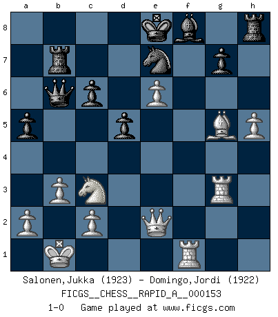Last move : 1-0 2014 March 20 21:57:0 [Event "FICGS__CHESS__RAPID_A__000153"] [Site "FICGS"] [Date "2013.12.05"] [Round "1"] [White "Salonen,Jukka"] [Black "Domingo,Jordi"] [Result "1-0"] [WhiteElo "1923"] [BlackElo "1922"] 1.e4 e5 2.Nf3 f5 3.exf5 e4 4.Ne5 Nf6 5.d4 d6 6.Ng4 Bxf5 7.Nxf6+ Qxf6 8.Nc3 Nc6 9.Be3 a6 10.Be2 Ne7 11.g4 Bg6 12.d5 c6 13.dxc6 bxc6 14.Qd2 Nc8 15.O-O-O Rb8 16.h4 h6 17.g5 Qf7 18.h5 Bf5 19.f3 hxg5 20.fxe4 Qb7 21.b3 Be6 22.Bxg5 Qb4 23.e5 d5 24.Rh4 Qa5 25.Ra4 Qc7 26.Rf1 a5 27.Bg4 Bxg4 28.Rxg4 Rb4 29.Qe2 Ne7 30.Rg3 Rb7 31.Kb1 Qb6 32.e6 1-0 Latvian counter-gambit Queenside Castling by player White (move 15) Player White won this chess game. Follow this game move after move (download)When in doubt... play Chess ! (Tevis) Ein Schachspiel besteht aus drei Phasen: Die erste, wenn du hofftst den Vorteil zu haben, die zweite, wenn du glaubst einen Vorteil zu haben, und die dritte.... wenn du weißt Du wirst verlieren. (Savielly Grigorievitsch Tartakower) En el Ajedrez, tal como en la vida, las bendiciones de hoy pueden ser el veneno del mañana. (Assaic) 'L'échange des dames est un coup dur pour les deux adversaires...' Un journaliste lors d'une partie du match Spassky-Fischer Empty your mind, be formless, shapeless — like water. (Bruce Lee)