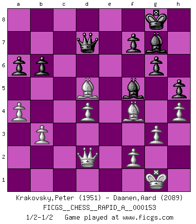 Last move : 1/2-1/2 2013 December 24 3:42:16 [Event "FICGS__CHESS__RAPID_A__000153"] [Site "FICGS"] [Date "2013.12.05"] [Round "1"] [White "Krakovsky,Peter"] [Black "Daanen,Aard"] [Result "1/2-1/2"] [WhiteElo "1951"] [BlackElo "2089"] 1.c4 e5 2.Nc3 Nf6 3.Nf3 Nc6 4.g3 g6 5.Bg2 Bg7 6.O-O O-O 7.d4 exd4 8.Nxd4 Re8 9.e3 Rb8 10.b3 Nxd4 11.exd4 d6 12.Bf4 a6 13.Qd2 Bf5 14.Rfe1 Qd7 15.a4 Rbd8 16.Rad1 c6 17.Rc1 h5 18.h4 b6 19.Bg5 Rxe1+ 20.Rxe1 Re8 21.Rxe8+ Qxe8 22.Bf4 d5 23.cxd5 Nxd5 24.Nxd5 cxd5 25.Bxd5 Qd7 1/2-1/2 English Opening Kingside Castling by player White (move 6) Kingside Castling by player Black (move 6) This chess game ended in a draw. Follow this game move after move (download)No one ever won a game by resigning. (Unknown) Die FIDE ist dabei in die Hände der russischen Mafia zu fallen. (Larry Evans) Por la belleza de sus partidas, la claridad de su juego y lo brillante de sus ideas, Fischer se creó el mismo como un artista de la misma estatura como Brahms, Rembrandt y Shakespeare. (David Levy) Les sacrifices démontrent seulement que quelqu'un a gaffé. (Savielly Tartacover) The greatest con, that he ever pulled... was making you believe... that he is you. (Revolver, movie)