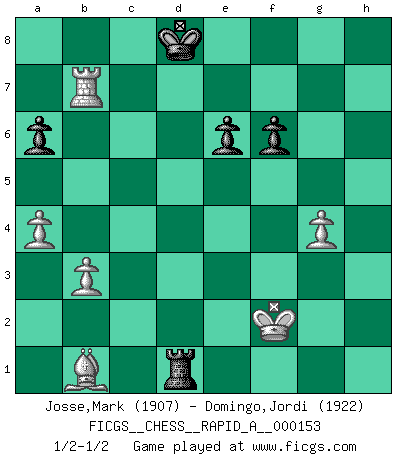 Last move : 1/2-1/2 2014 March 5 19:44:19 [Event "FICGS__CHESS__RAPID_A__000153"] [Site "FICGS"] [Date "2013.12.05"] [Round "1"] [White "Josse,Mark"] [Black "Domingo,Jordi"] [Result "1/2-1/2"] [WhiteElo "1907"] [BlackElo "1922"] 1.d4 d5 2.c4 dxc4 3.e3 Nf6 4.Bxc4 e6 5.Nf3 c5 6.O-O a6 7.Bd3 Nbd7 8.a4 b6 9.Qe2 Bb7 10.Rd1 Qc7 11.Nbd2 Be7 12.b3 Nd5 13.Bb2 O-O 14.Rac1 Rfd8 15.Bb1 Rac8 16.Qd3 N7f6 17.Ne5 Qb8 18.h3 cxd4 19.Bxd4 Rxc1 20.Rxc1 Bc5 21.Bxc5 bxc5 22.Ng4 Nxg4 23.Qxh7+ Kf8 24.hxg4 Nxe3 25.Qh8+ Ke7 26.Qh4+ f6 27.Qh7 Rxd2 28.Qxg7+ Kd6 29.Qh6 Rxf2 30.Qxe3 Rxg2+ 31.Kf1 Ke7 32.Qxc5+ Qd6 33.Qc7+ Qd7 34.Qf4 Qd2 35.Rc7+ Kd8 36.Qxd2+ Rxd2 37.Rxb7 Rd1+ 38.Kf2 1/2-1/2 Queen's gambit accepted Kingside Castling by player White (move 6) Kingside Castling by player Black (move 13) This chess game ended in a draw. Follow this game move after move (download)I like the moment when I break a man's ego. (Bobby Fischer) Unter Putin wird alles Geld aus Russland wie von einem Staubsauger nach Moskau umgeleitet, das ist wie ein schwarzes Loch. (Garry Kasparov) Juega la Apertura como un libro, el Juego Medio como un mago y los Finales como una máquina. (Spielmann) Le jeu d'échecs fait naître et fortifie en nous plusieurs qualités précieuses dans le cours de l'existence, telles que la prévoyance, la circonspection, la prudence, et la persévérance. (Benjamin Franklin - 1783, la morale des échecs) A person who never made a mistake never tried anything new. (Albert Einstein)