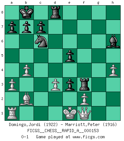 Last move : 0-1 2014 March 31 20:35:43 [Event "FICGS__CHESS__RAPID_A__000153"] [Site "FICGS"] [Date "2013.12.05"] [Round "1"] [White "Domingo,Jordi"] [Black "Marriott,Peter"] [Result "0-1"] [WhiteElo "1922"] [BlackElo "1916"] 1.g4 d5 2.h3 e5 3.Bg2 h5 4.g5 Be6 5.d3 Nc6 6.Nf3 Qd7 7.Nc3 O-O-O 8.a3 Nge7 9.h4 Kb8 10.b4 Ng6 11.e3 Bg4 12.Qd2 d4 13.Ne4 f5 14.gxf6 gxf6 15.Bb2 Bh6 16.Nxf6 Qf5 17.Nxg4 Qxg4 18.Qe2 Rhf8 19.Rh3 dxe3 20.Rg3 Nf4 21.Rxg4 hxg4 22.Qf1 gxf3 23.Bxf3 Nxd3+ 24.cxd3 Rxf3 0-1 Grob's attack Queenside Castling by player Black (move 7) Player Black won this chess game. Follow this game move after move (download)Many Chess players were surprised when after the game, Fischer quietly explained: 'I had already analyzed this possibility' in a position which I thought was not possible to foresee from the opening. (Mikhail Tal) Wie kann ich Remis annehmen? Ich weiß ja gar nicht, wie ich stehe! (Fritz Sämisch) Sin errores no puede haber brillantez. (Emanuel Lasker) Le jeu d'échecs est comme rejeté hors du temps. (Antoine de Saint-Exupéry) Life is pain my dear and anyone who says otherwise is selling something. (Princess Bride)