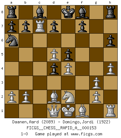 Last move : 1-0 2014 January 4 21:17:2 [Event "FICGS__CHESS__RAPID_A__000153"] [Site "FICGS"] [Date "2013.12.05"] [Round "1"] [White "Daanen,Aard"] [Black "Domingo,Jordi"] [Result "1-0"] [WhiteElo "2089"] [BlackElo "1922"] 1.c4 g5 2.d4 h6 3.h4 g4 4.e4 c5 5.Be3 g3 6.fxg3 Nf6 7.Nc3 Qa5 8.Bd2 Qc7 9.Nge2 cxd4 10.Nd5 Nxd5 11.cxd5 Na6 12.Rc1 e5 13.Rxc7 1-0 English Opening Player White won this chess game. Follow this game move after move (download)The passion for playing Chess is one of the most unaccountable in the world. (H.G. Wells) Bis zum Jahr 1971 verlief in meiner Schachkariere alles glatt. Dieses dramatische Match [Fischer-Taimanov 6:0] machte mein Leben zur Hölle. (Mark Taimanov) Puntos débiles o agujeros en la posición de tu oponente deben de ser ocupados por piezas, no Peones. (Siegbert Tarrasch) Les erreurs sont comme les malheurs, elles n'arrivent jamais seules. (Siegbert Tarrasch) Hello Thibault, if I have had a plan (and I had one, I hope), I have forgotten it during the last week... - Hello Heinz-Georg. What do you mean a plan ? (Anonymous players, during a Big Chess game)
