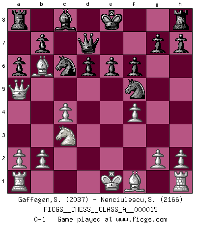 Last move : 0-1 2007 June 29 3:12:33 [Event "FICGS__CHESS__CLASS_A__000015"] [Site "FICGS"] [Date "2007.02.10"] [Round "1"] [White "Gaffagan,Steven"] [Black "Nenciulescu,Silviu"] [Result "0-1"] [WhiteElo "2037"] [BlackElo "2166"] 1.c4 Nf6 2.Nc3 e6 3.e4 c5 4.e5 Ng8 5.Nf3 Nc6 6.d4 cxd4 7.Nxd4 Nxe5 8.Ndb5 a6 9.Nd6+ Bxd6 10.Qxd6 f6 11.Be3 Ne7 12.Bb6 Nf5 13.Qc5 d6 14.Qa5 Qd7 15.f4 Nc6 0-1 This chess game has been lost on time (started : 2007.02.10 23:13:59) English : Mikenas-Carls, Sicilian variation Player Black won this chess game. Follow this game move after move (download)Chess is life. (Bobby Fischer) Schachspieler können ausgezeichnet Varianten am Schachbrett berechnen, aber nicht im realen Leben. Zu stark ist der Individualismus im Schach ausgeprägt, und für viele ist ein kleiner momentaner persönlicher Vorteil wichtiger als ein weit größerer Vorteil von morgen. (Anatoly Karpov) Los Peones son nacidos libres, y aún así, se encuentran encadenados por todos lados. (Rick Kennedy) Fischer est le meilleur joueur du monde et Karpov n'est qu'un joueur de bistrot. (Garry Kasparov, agé de 16 ans) May the force be with you. (Han Solo in Star Wars ep.4)