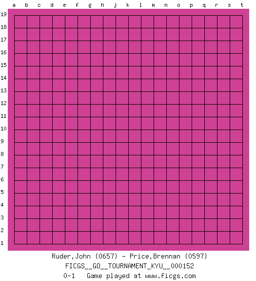 Last move : 0-1 2014 January 5 22:35:57 [Event "FICGS__GO__TOURNAMENT_KYU__000152"] [Site "FICGS"] [Date "2013.12.06"] [Round "1"] [Black "Ruder,John"] [White "Price,Brennan"] [Result "0-1"] [Rating 1 "0657"] [Rating 2 "0597"] 0-1 This go game has been lost on time (started : 2013.12.06 17:27:38) Here are the names of the openings (joseki) played in the four corners : Player White won this Go (weiqi, baduk) game. Follow this game move after move (download)Empty triangles are bad. (Anonymous) A married woman is like a fish riding a bicycle. (Rodolfo d'Ettorre)