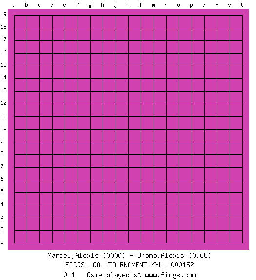 Last move : 0-1 2014 January 5 22:35:57 [Event "FICGS__GO__TOURNAMENT_KYU__000152"] [Site "FICGS"] [Date "2013.12.06"] [Round "1"] [Black "Marcel,Alexis"] [White "Bromo,Alexis"] [Result "0-1"] [Rating 1 "0000"] [Rating 2 "0968"] 0-1 This go game has been lost on time (started : 2013.12.06 17:27:38) Here are the names of the openings (joseki) played in the four corners : Player White won this Go (weiqi, baduk) game. Follow this game move after move (download)Corner, side, centre. (Anonymous) Is not life a hundred times too short to bore ourselves ? (Friedrich Nietzsche)