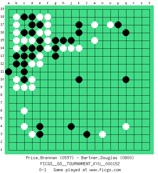 Last move : 0-1 2014 January 12 19:50:29 [Event "FICGS__GO__TOURNAMENT_KYU__000152"] [Site "FICGS"] [Date "2013.12.06"] [Round "1"] [Black "Price,Brennan"] [White "Bartner,Douglas"] [Result "0-1"] [Rating 1 "0597"] [Rating 2 "0800"] 1.q16 q4 2.d17 c4 3.k16 d15 4.d13 f16 5.e15 e16 6.d16 c15 7.e14 b17 8.c16 b16 9.e17 f17 10.c14 b15 11.c18 e18 12.d18 f18 13.q10 c9 14.e3 d3 15.e4 c6 16.j4 n3 17.l3 o17 18.p17 m17 19.k17 m15 20.k10 k14 21.j15 j14 22.h15 h14 23.g15 f15 24.g14 f14 25.g13 e13 26.d14 e12 27.c11 d12 28.c12 b14 29.c13 d10 30.c10 d9 31.b13 b18 32.a11 b10 33.b12 b9 0-1 Comment by player 2 : Douglas Bartner : Thanks for the game, hope to play again sometime. Here are the names of the openings (joseki) played in the four corners : Corner d16 : d17 d15 Komoku (Somok, Xiao~mu`) 3-4 Point. The komoku (3-4) point is the traditional corner enclosure move.. Ikken Takagakari (Hankan Nop'dakeolch'im, Yi Gaogua`jiao~, 1-Space High Approach). The 5-4 approach move has become more popular in modern times, as modern Go emphasizes speed and influence. Corner q16 : q16 o17 Hoshi (Hwajeom, Seongjeom, Xingwei`) 4-4 Point. The star or hoshi (4-4) point, emphasizing influence at the potential expense of territory. Ikken Kakari (Hankan Keolch'im, Yi Gua`jiao~, 1-Space Low Approach). White 2 is the standard approach move to the 4-4. Player White won this Go (weiqi, baduk) game. Follow this game move after move (download)There is no territory in the centre. (Anonymous) However beautiful the strategy, you should occasionally look at the results. (Winston Churchill)
