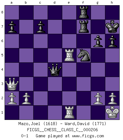 Last move : 0-1 2014 April 24 5:35:51 [Event "FICGS__CHESS__CLASS_C__000206"] [Site "FICGS"] [Date "2013.12.12"] [Round "1"] [White "Mazo,Joel"] [Black "Ward,David"] [Result "0-1"] [WhiteElo "1618"] [BlackElo "1771"] 1.e4 e5 2.Nf3 Nc6 3.c3 d5 4.Bb5 dxe4 5.Nxe5 Qd5 6.Bxc6+ bxc6 7.d4 Bd6 8.O-O c5 9.Qa4+ Kf8 10.Bf4 Nf6 11.Nd2 Bb7 12.f3 cxd4 13.cxd4 h6 14.Rac1 g6 15.fxe4 Nxe4 16.Nxg6+ fxg6 17.Qd7 Kg8 18.Bxd6 Nxd6 19.Nf3 Rh7 20.Qg4 Rg7 21.Rfe1 Nf5 22.Rc5 Qd6 23.Rce5 Bxf3 24.Qxf3 Qxd4+ 25.Kh1 Rf8 26.Qb3+ Kh7 27.Qa3 Rgf7 0-1 Ponziani Opening Kingside Castling by player White (move 8) Player Black won this chess game. Follow this game move after move (download)Fischer wanted to give the Russians a taste of their own medicine. (Larry Evans) Offener Brief an US-Präsident Bush anlässlich der Verhaftung Bobby Fishers: Verhaften Sie mich. Stecken Sie mich in dieselbe Zelle wie Bobby Fisher und geben Sie uns ein Schachspiel mit. (Boris Vassilievich Spassky) En manos de Fischer's, una diminuta ventaja teórica es tan buena como tener una Reina de ventaja. (Isaac Kashdan) Pour se monter efficace, un Cavalier a besoin d'avant-postes ! Les Cavaliers font les meilleurs bloqueurs de pions passés. Life is pleasant. Death is peaceful. It's the transition that's troublesome. (Isaac Asimov)