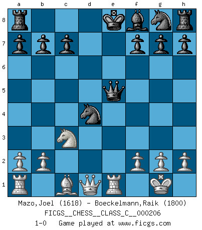 Last move : 1-0 2014 January 17 1:5:25 [Event "FICGS__CHESS__CLASS_C__000206"] [Site "FICGS"] [Date "2013.12.12"] [Round "1"] [White "Mazo,Joel"] [Black "Boeckelmann,Raik"] [Result "1-0"] [WhiteElo "1618"] [BlackElo "1800"] 1.e4 e5 2.Nf3 Nc6 3.c3 Nf6 4.d4 exd4 5.e5 Ng8 6.cxd4 d6 7.Bb5 Bd7 8.O-O dxe5 9.d5 Nd4 10.Bxd7+ Qxd7 11.Nxe5 Qxd5 12.Nc3 Qxe5 13.Re1 1-0 Ponziani : Jaenisch counter-attack Kingside Castling by player White (move 8) Player White won this chess game. Follow this game move after move (download)Strategy requires thought, tactics require observation. (Max Euwe) Stil? Ich habe keinen Stil! (Anatoly Karpov) Yo nunca en mi vida he jugado la Defensa Francesa, que viene siendo la más aburrida de todas las Aperturas. (Wilhelm Steinitz) Seul un grand joueur sait à quel point il joue faiblement. (Xavier Tartacover) No man has ever achieved immortality in his own life time. (Unknown)