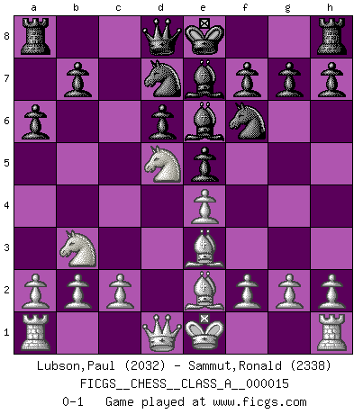 Last move : 0-1 2007 March 29 3:13:32 [Event "FICGS__CHESS__CLASS_A__000015"] [Site "FICGS"] [Date "2007.02.10"] [Round "1"] [White "Lubson,Paul"] [Black "Sammut,Ronald"] [Result "0-1"] [WhiteElo "2032"] [BlackElo "2338"] 1.e4 c5 2.Nf3 d6 3.d4 cxd4 4.Nxd4 Nf6 5.Nc3 a6 6.Be3 e5 7.Nb3 Be6 8.Be2 Be7 9.Nd5 Nbd7 0-1 This chess game has been lost on time (started : 2007.02.10 23:13:59) Sicilian : Najdorf, Byrne (English) attack Player Black won this chess game. Follow this game move after move (download)A thorough understanding of the typical mating continuations makes the most complicated sacrificial combinations leading up to them not only not difficult, but almost a matter of course. (Siegbert Tarrasch) Es hat in meinem Leben Zeiten gegeben, in denen das Schachspiel, wenn nicht zum Lebenszweck, so doch zu einem regelrechten Lebensersatz geworden ist. Man fühlt sich in solchen Zeiten nicht so, als besäße man eine göttliche Gabe, sondern eher so, als sei man von ihr besessen. (Garry Kasparov) ¡Examina movidas que hagan daño! Un buen ojo for movidas desvastantes es mucho mas importante que el conocimiento de principios estratégicos. (Purdy) Dieu déplace le joueur, et celui-ci la pièce. Quel Dieu derrière Dieu commence donc la trame ? Arturo Perez-Reverte (prix de littérature policière 1993). In every real man a child is hidden that wants to play. (Friedrich Nietzsche)